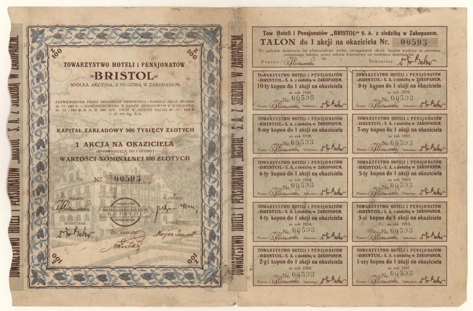 Zdjęcie akcji Towarzystwo Hoteli i Pensjonatów "Bristol" Spółka Akcyjna - 1