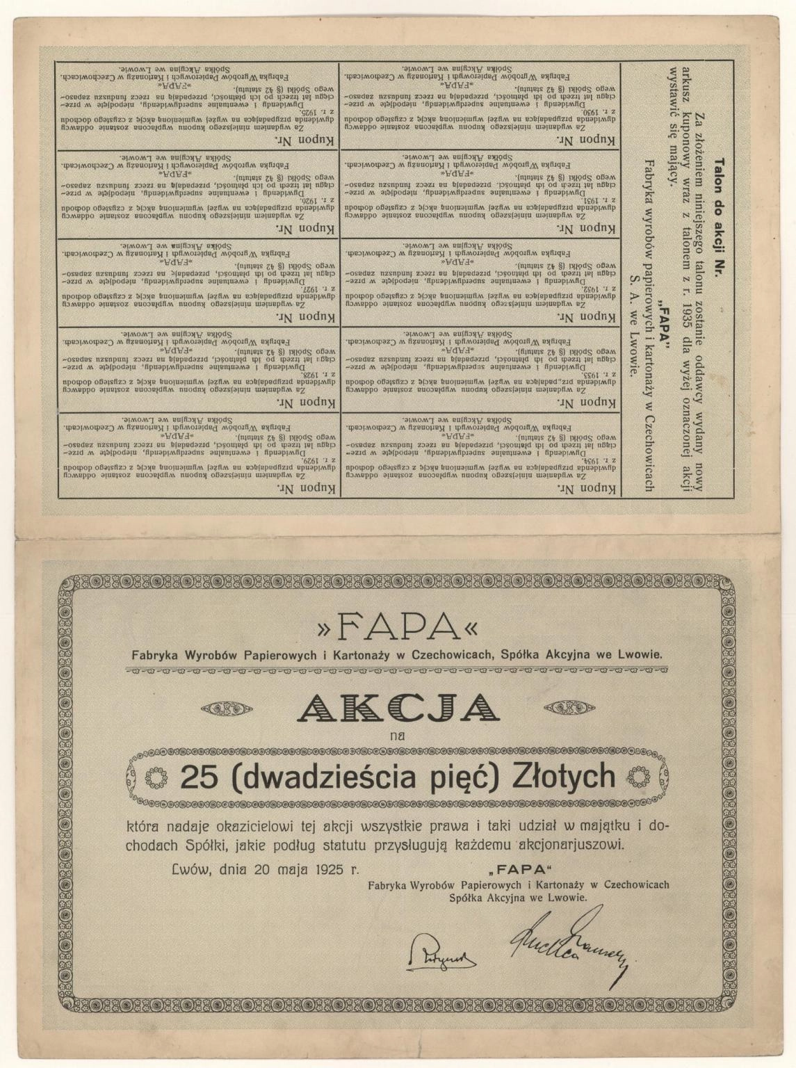 Zdjęcie akcji "Fapa" Fabryka Wyrobów Papierowych i Kartonaży w Czechowicach, Spółka Akcyjna we Lwowie - 1