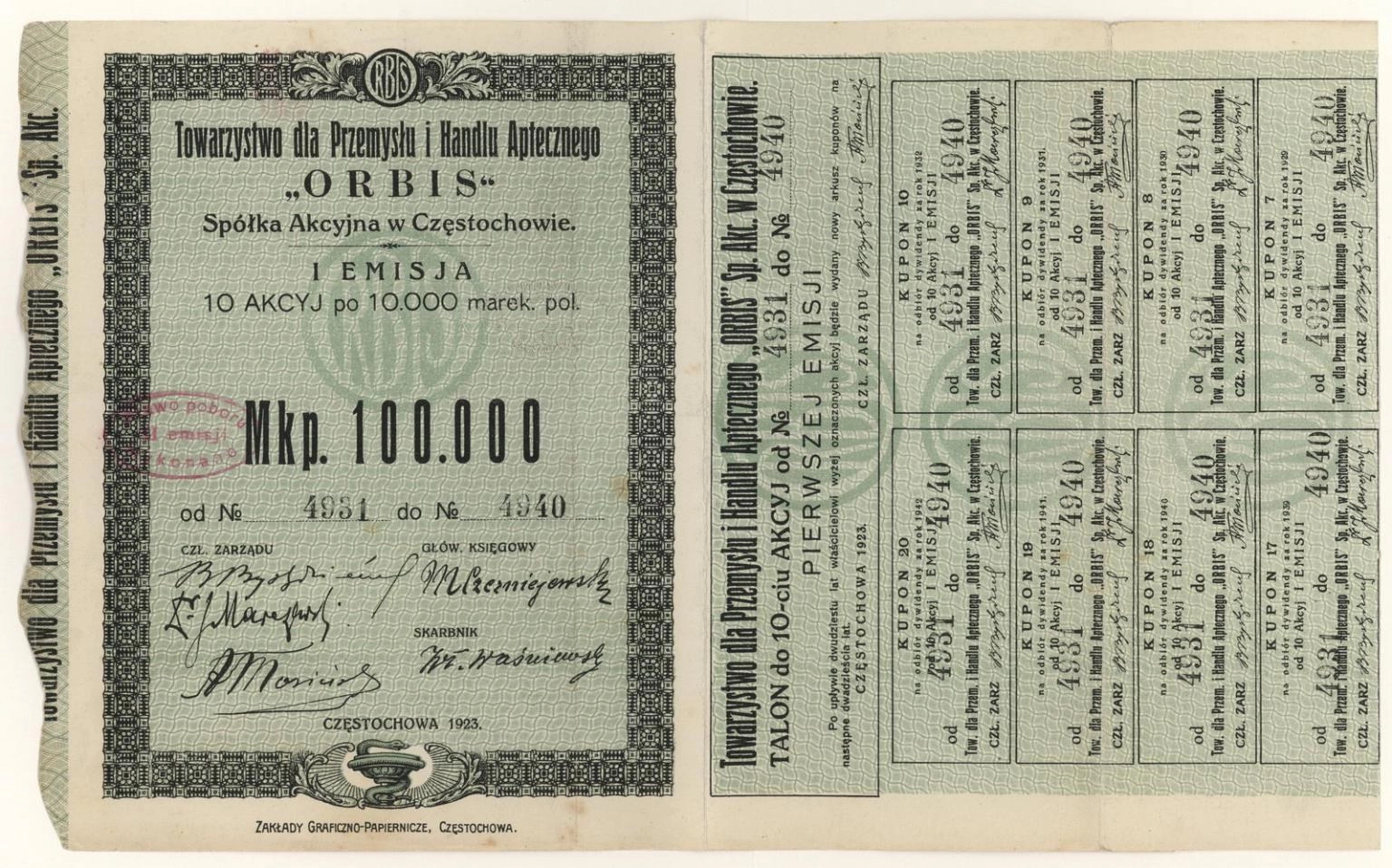 Zdjęcie akcji Towarzystwo dla Przemysłu i Handlu Aptecznego "Orbis" Spółka Akcyjna w Częstochowie - 2