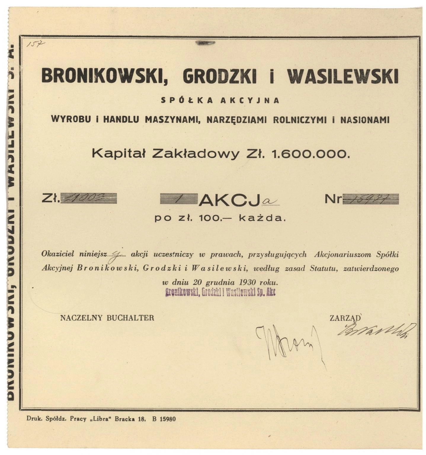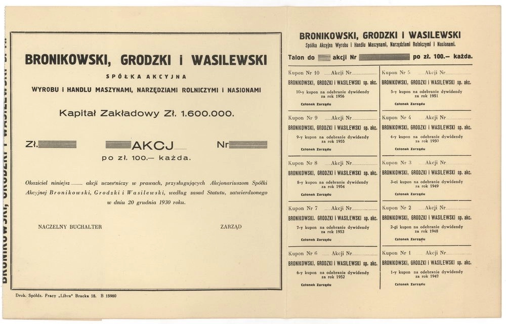 "Bronikowski, Grodzki i Wasilewski" Spółka Akcyjna Wyrobu i Handlu Maszynami, Narzędziami Rolniczymi i Nasionami