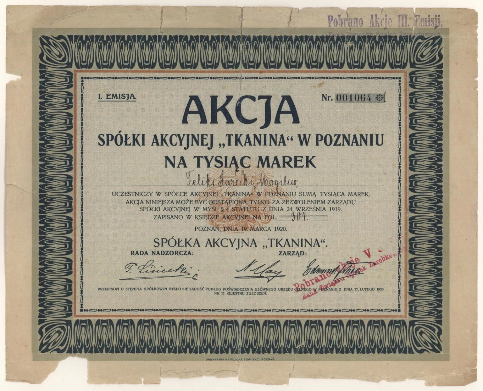 Akcja | Emisja I | imienna
